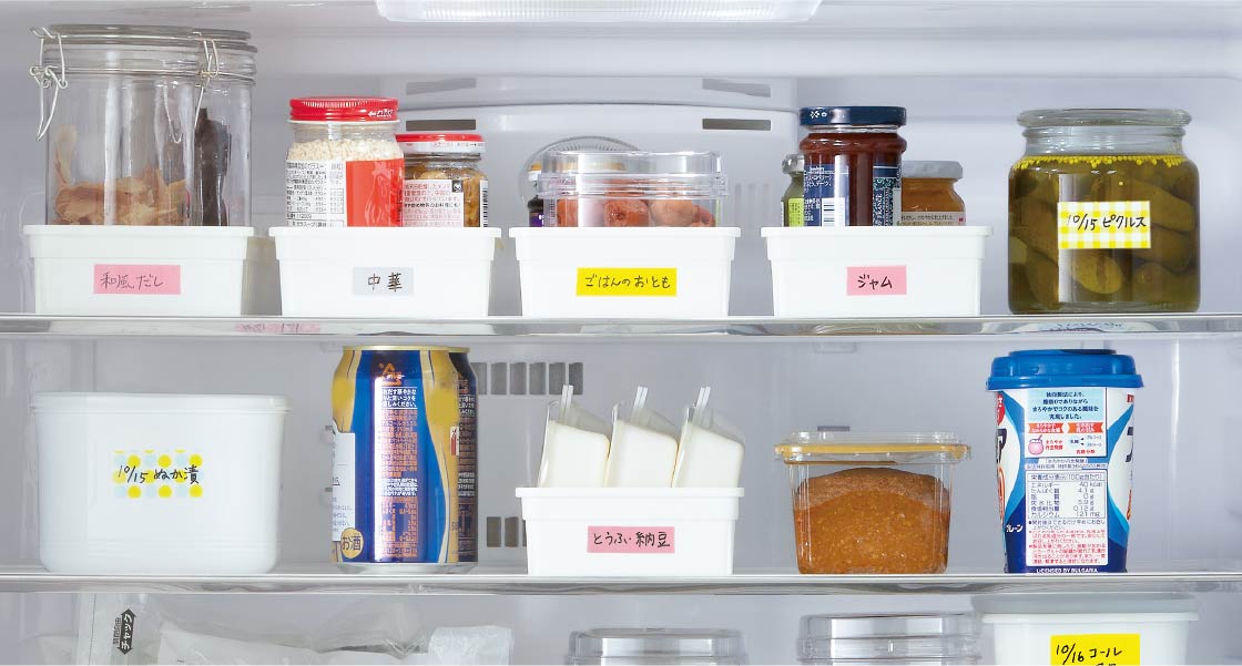 家族みんなで使う冷蔵庫。棚やカゴごとに食材や調味料をエリア分けしていても、